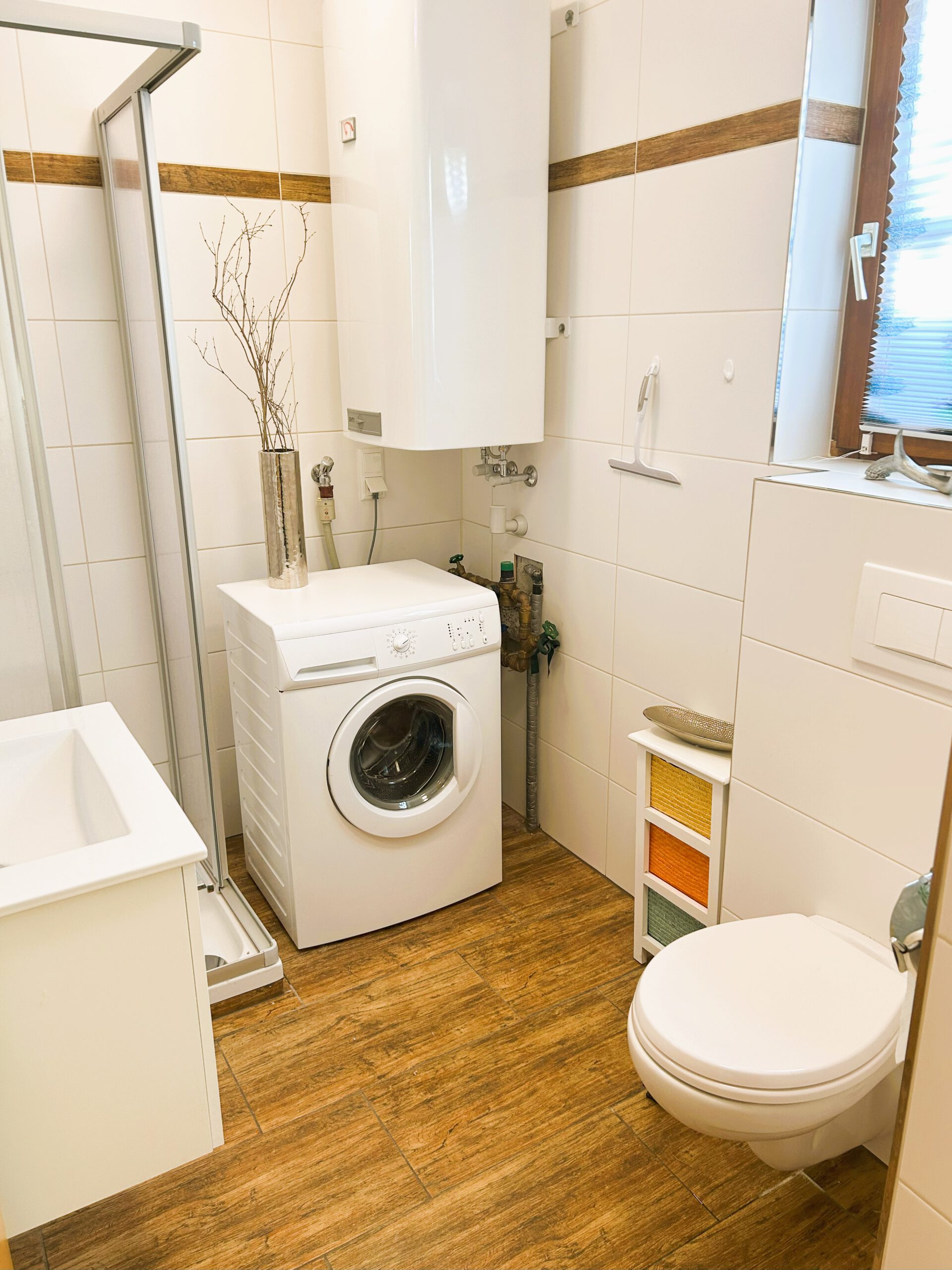 Im Untergeschoss befindet sich ein Bad mit Toilette, Dusche und Waschmaschine sowie ein Haarfön.