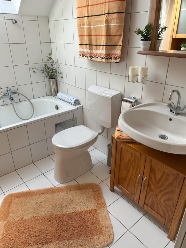Im Obergeschoss können Sie in der Badewanne entspannen. Zusätzlich ist eine Toilette enthalten.