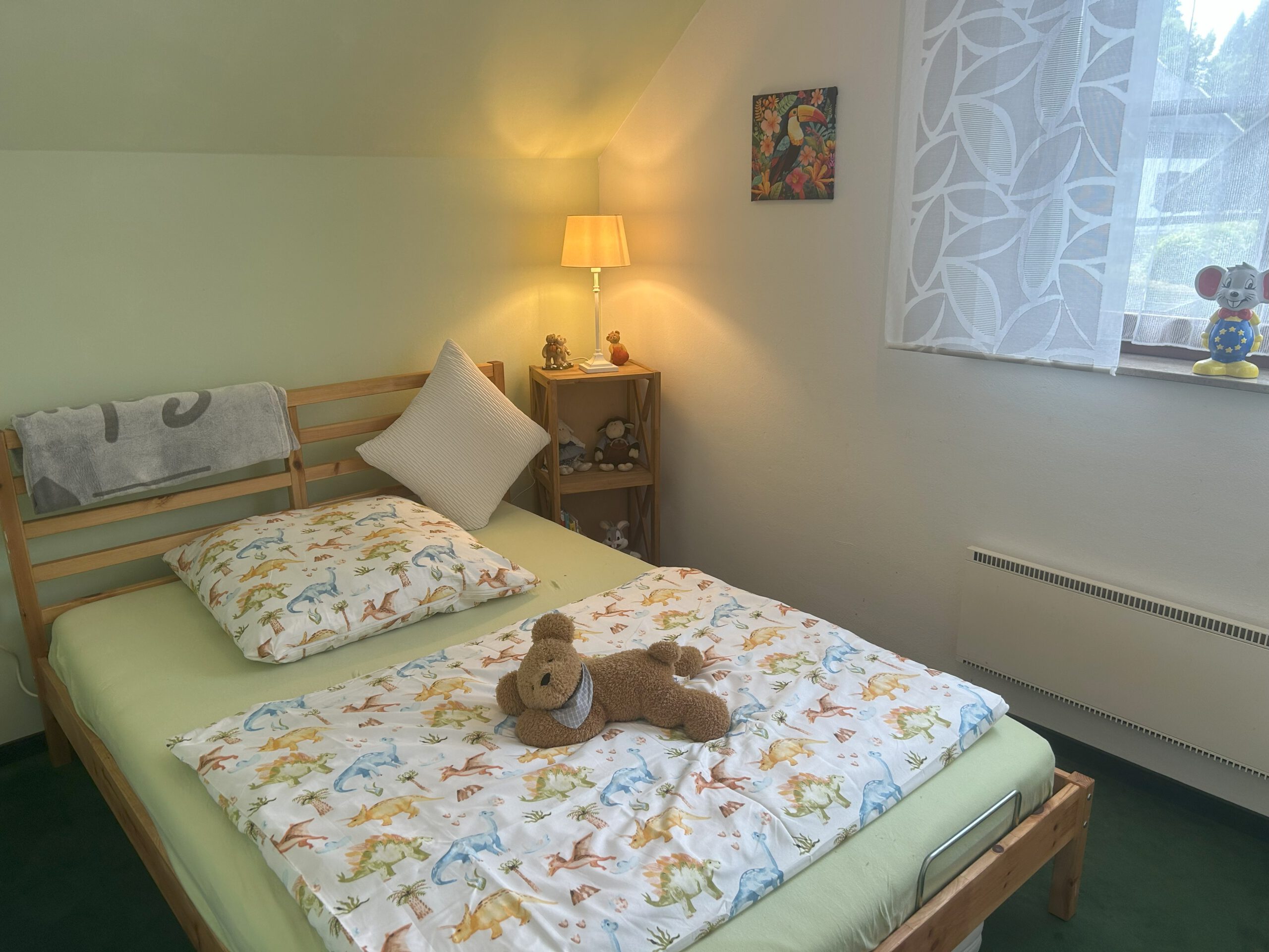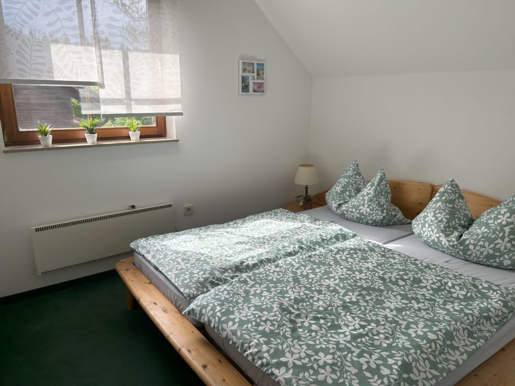 Gästeschlafzimmer: Neben dem Doppelbett finden Sie hier auch ein Kinderreisebett. Im Schrank liegen außerdem weitere Kuscheldecken.