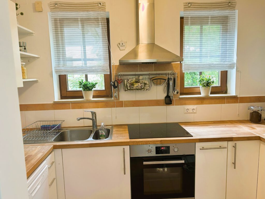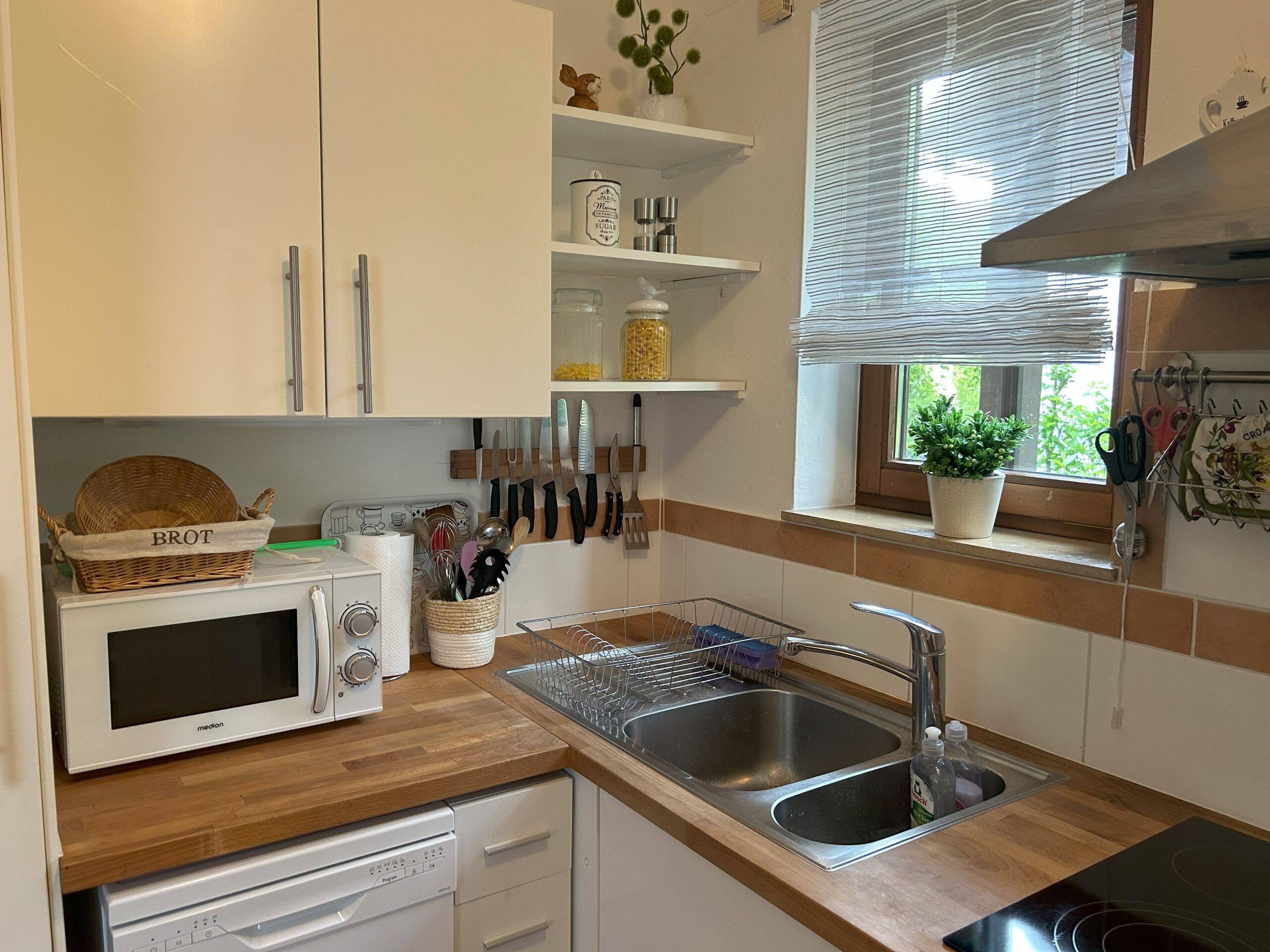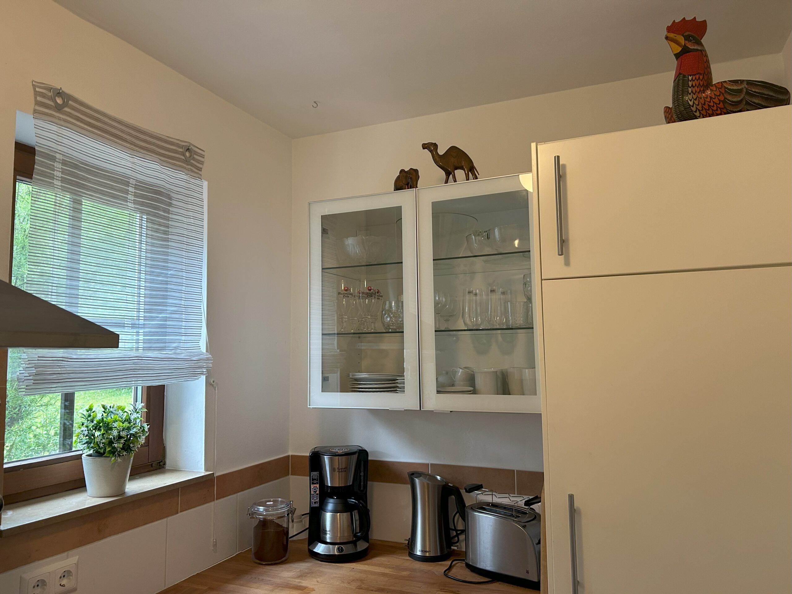 In unserer gut ausgestatteten Küche finden Sie u.a. Kaffeemaschine, Toaster, Wasserkocher, Mikrowelle, Kühlschrank mit Gefrierfach sowie eine kleine Spülmaschine (Tabs bitte mitbringen). Ebenso sind ein Staubsauger und ein Bügelbrett mit Bügeleisen vorhanden.