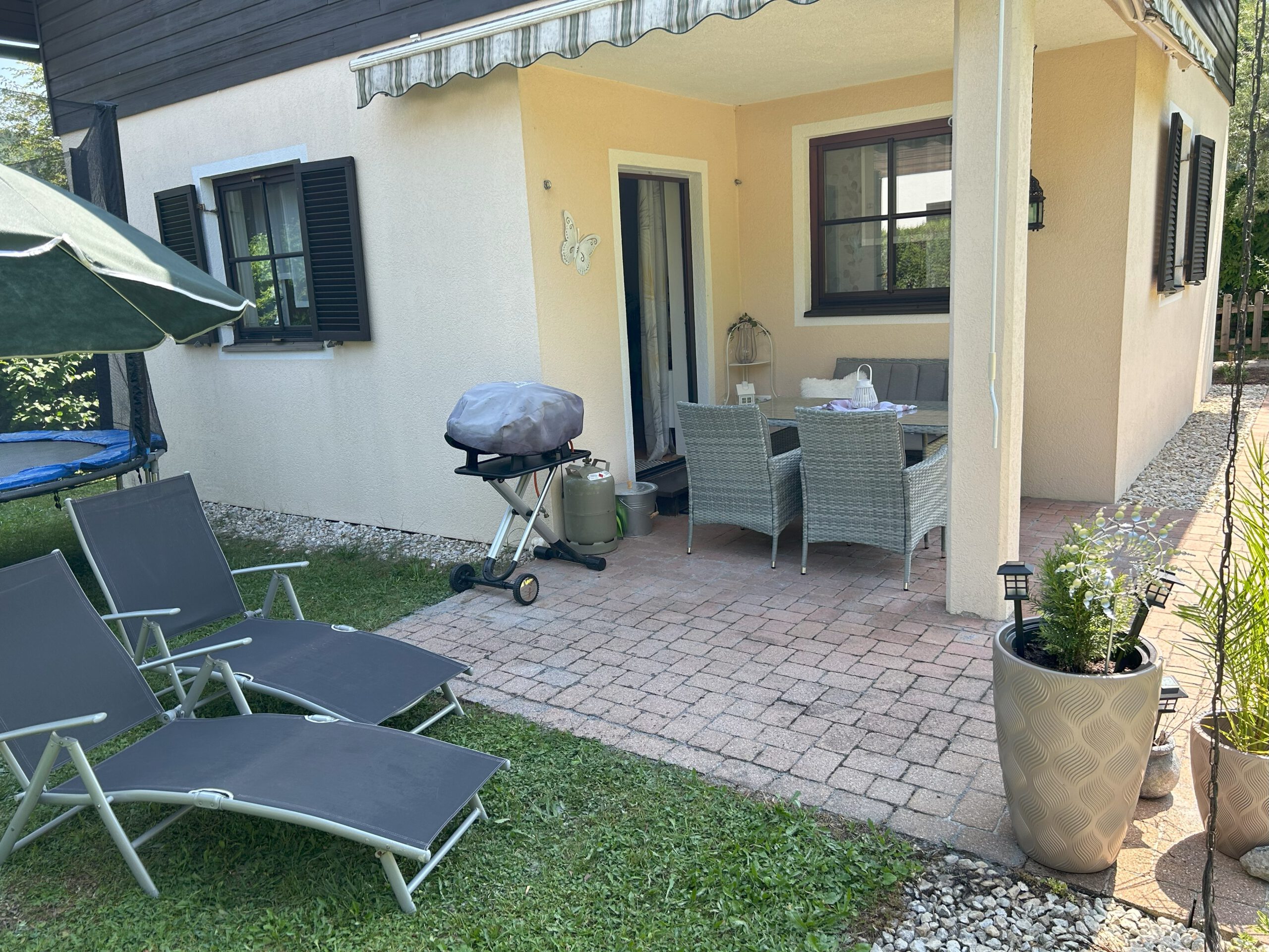 Erholen Sie sich auf der gemütlichen Terrasse mit Essgruppe und Liege nach einem wunderschönen Urlaubstag in Kärnten und lassen den Tag entspannt ausklingen.